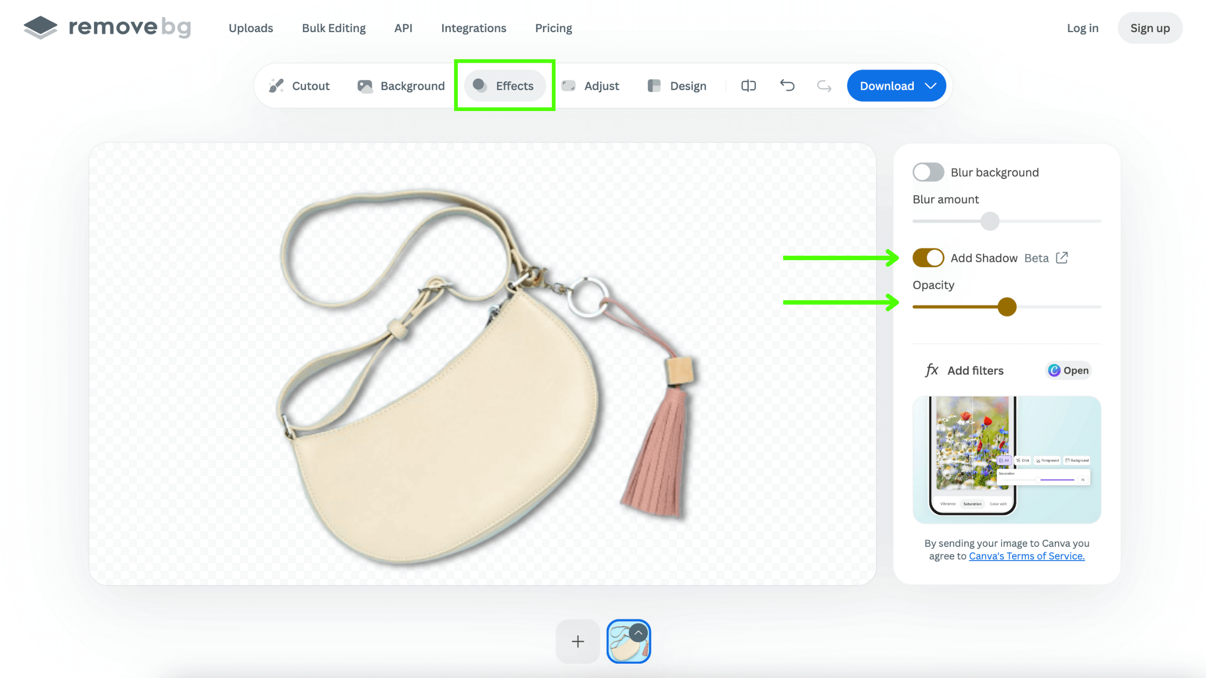 To make your photo look more realistic and anchored in space, you can add a 3D shadow by clicking on > Effects. Then select the “Add Shadow” toggle and adjust its darkness with the “Opacity” slider.
