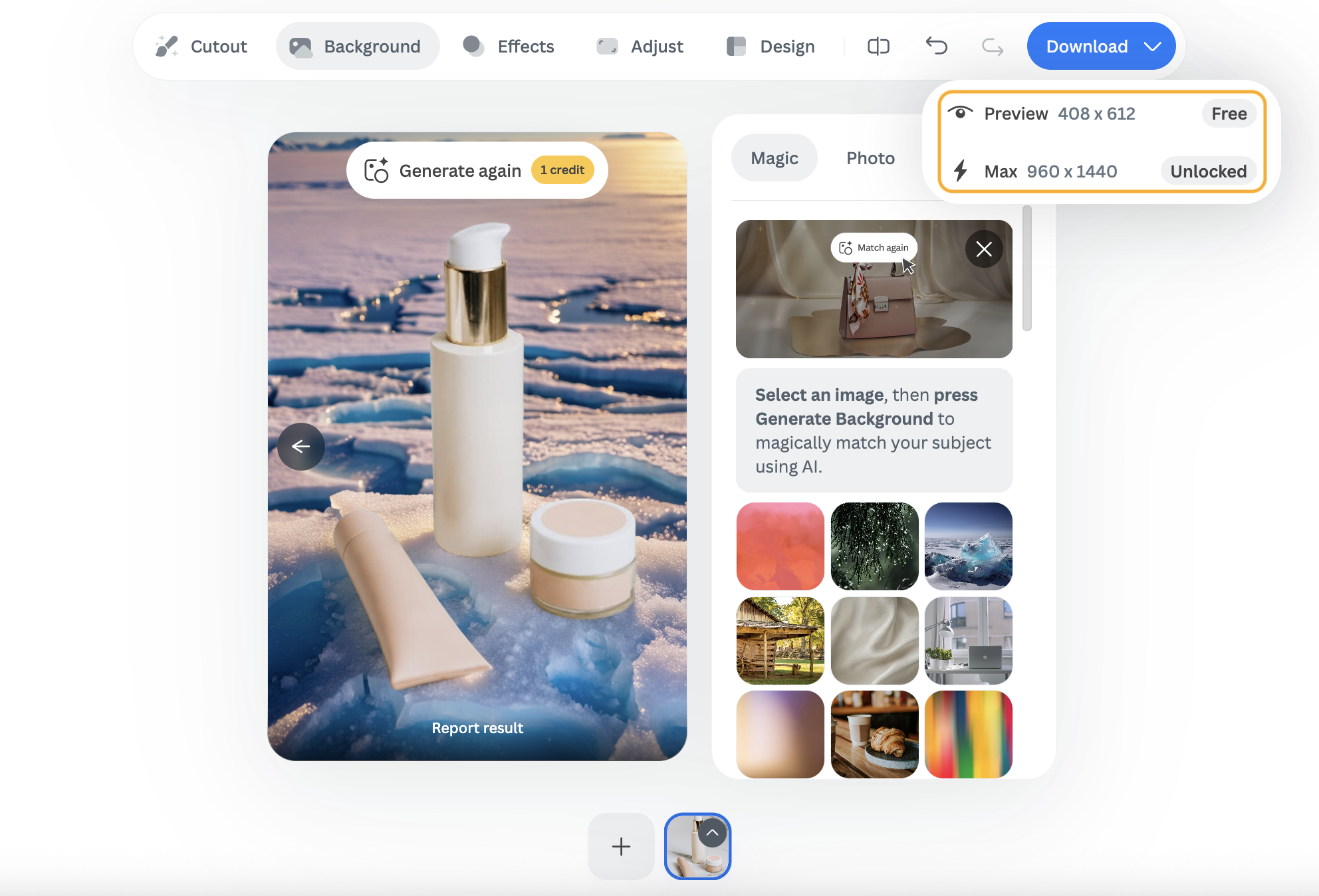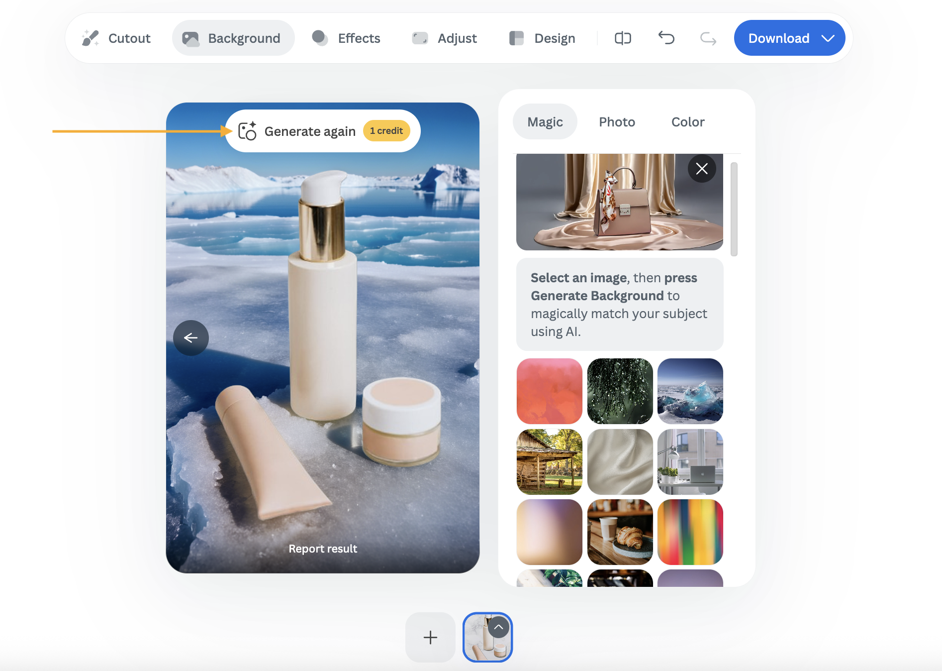 The AI will generate a background, automatically adjusting the perspective and orientation for a natural look. If you’re not totally happy with the result, simply click “Generate again” to see more options.