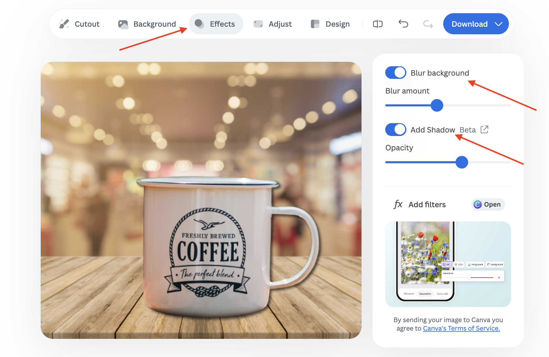 For additional enhancements, click on “Effects” to blur the background or fine-tune elements, such as shadows and filters.