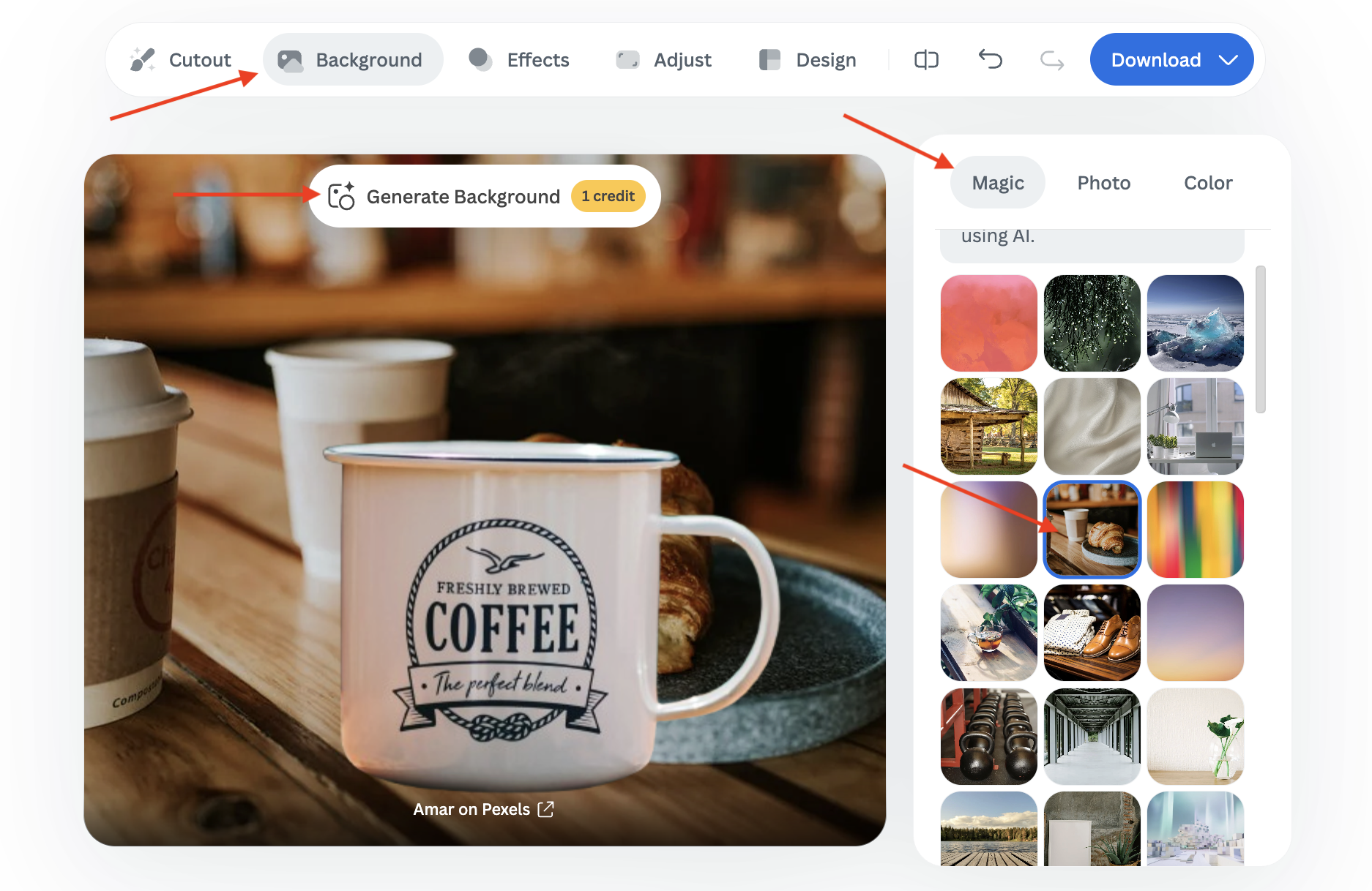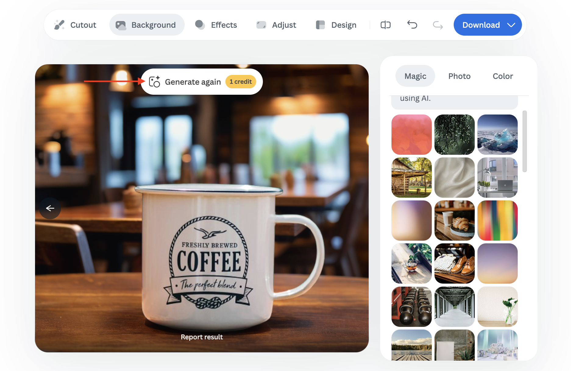 Click on the “Magic” tab, choose a background for inspiration, and let the AI create a unique scene based on your selection by clicking on "Generate Background."