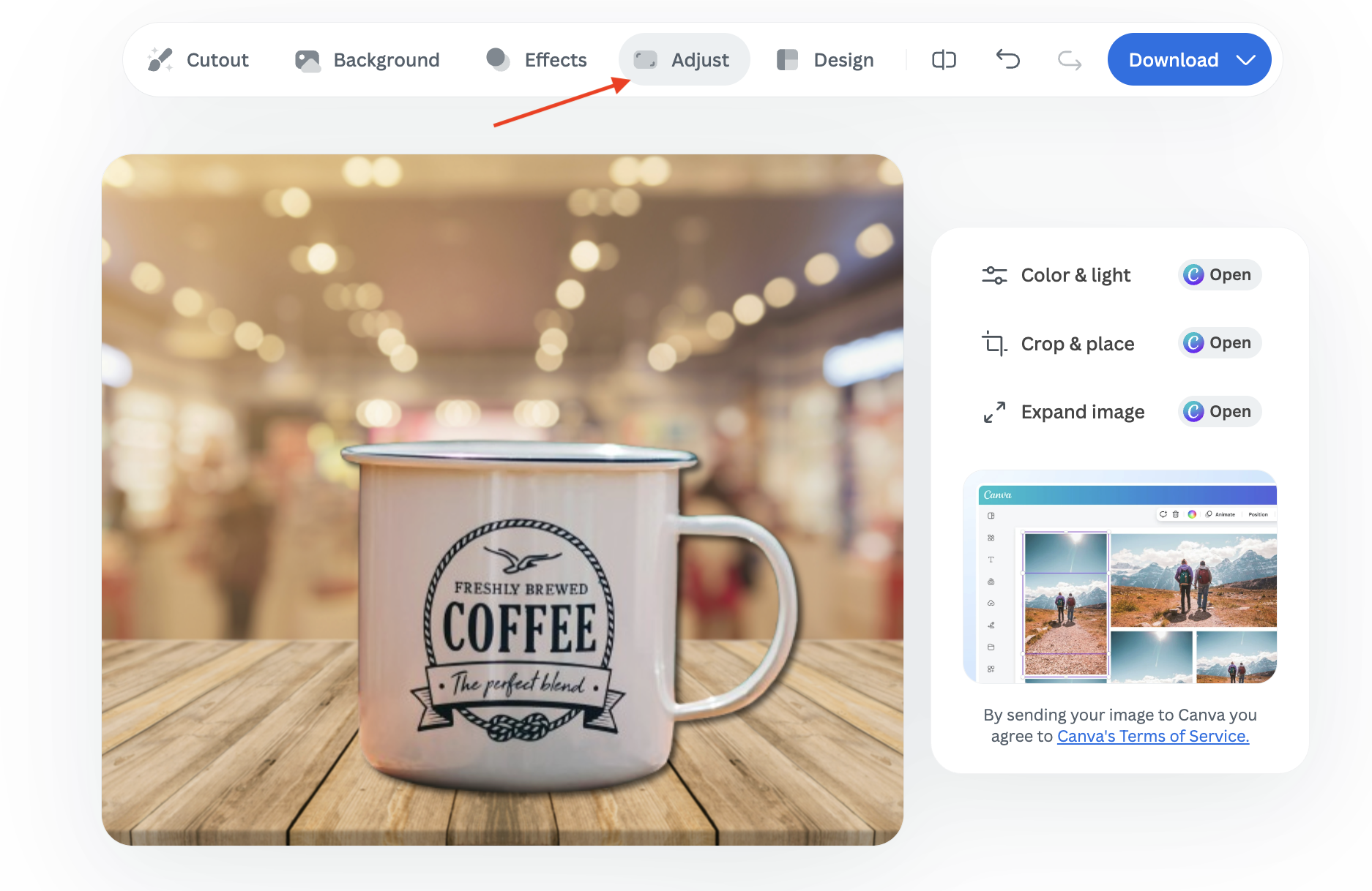 You can also select “Adjust” to edit color and lighting, crop, or expand your photo. You’ll then be redirected to Canva for a seamless editing experience.