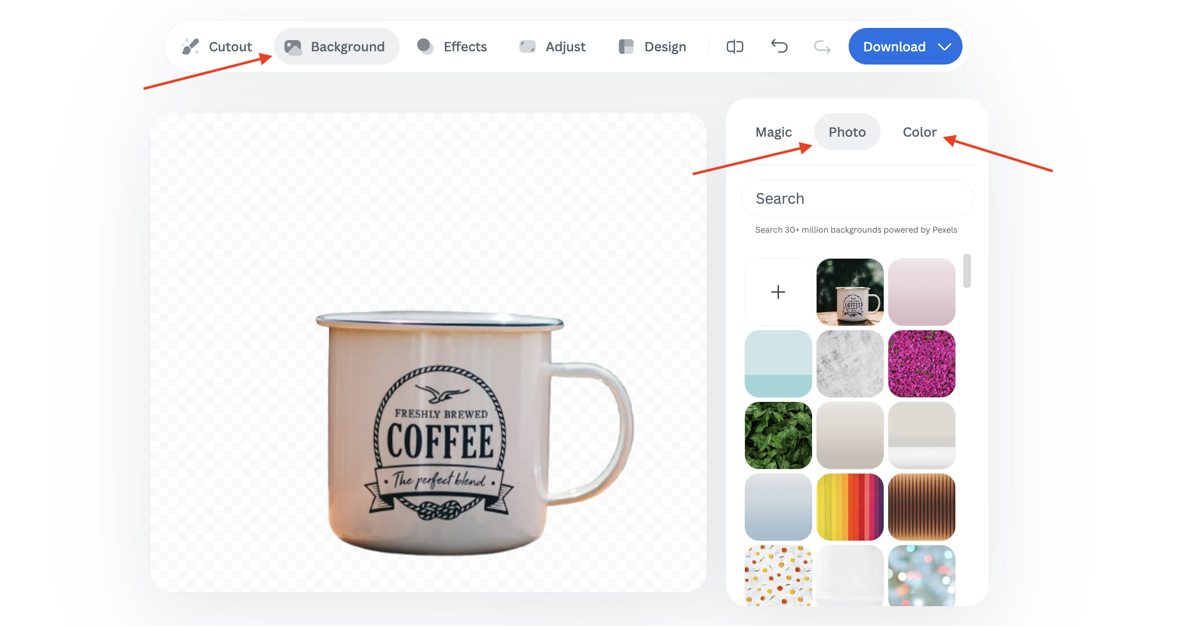 Click on the “Background” tab to choose between a solid color or a photo background.