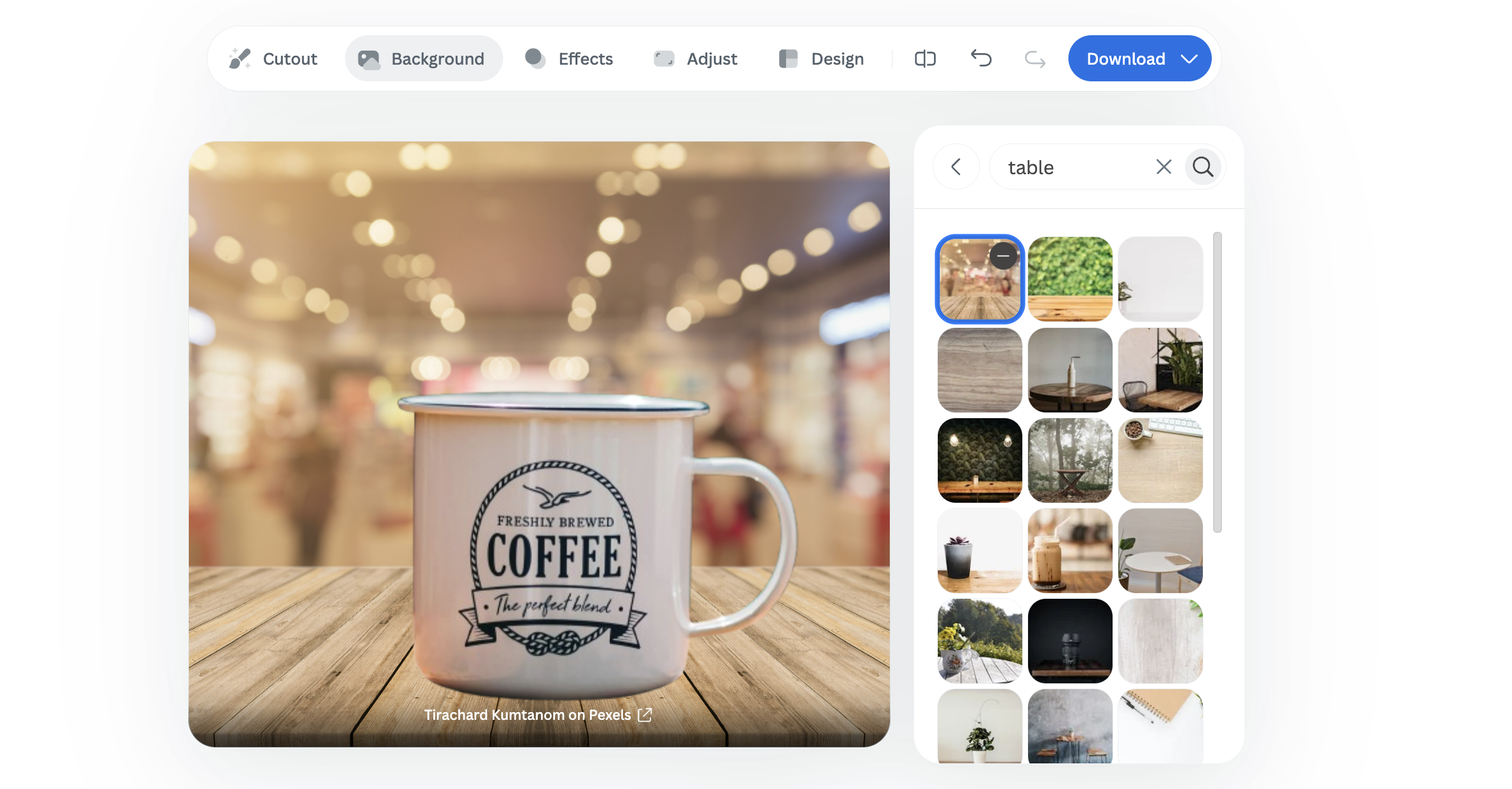 You can use the search bar to refine your search. For instance, you can type “table” to instantly find matching backdrops.