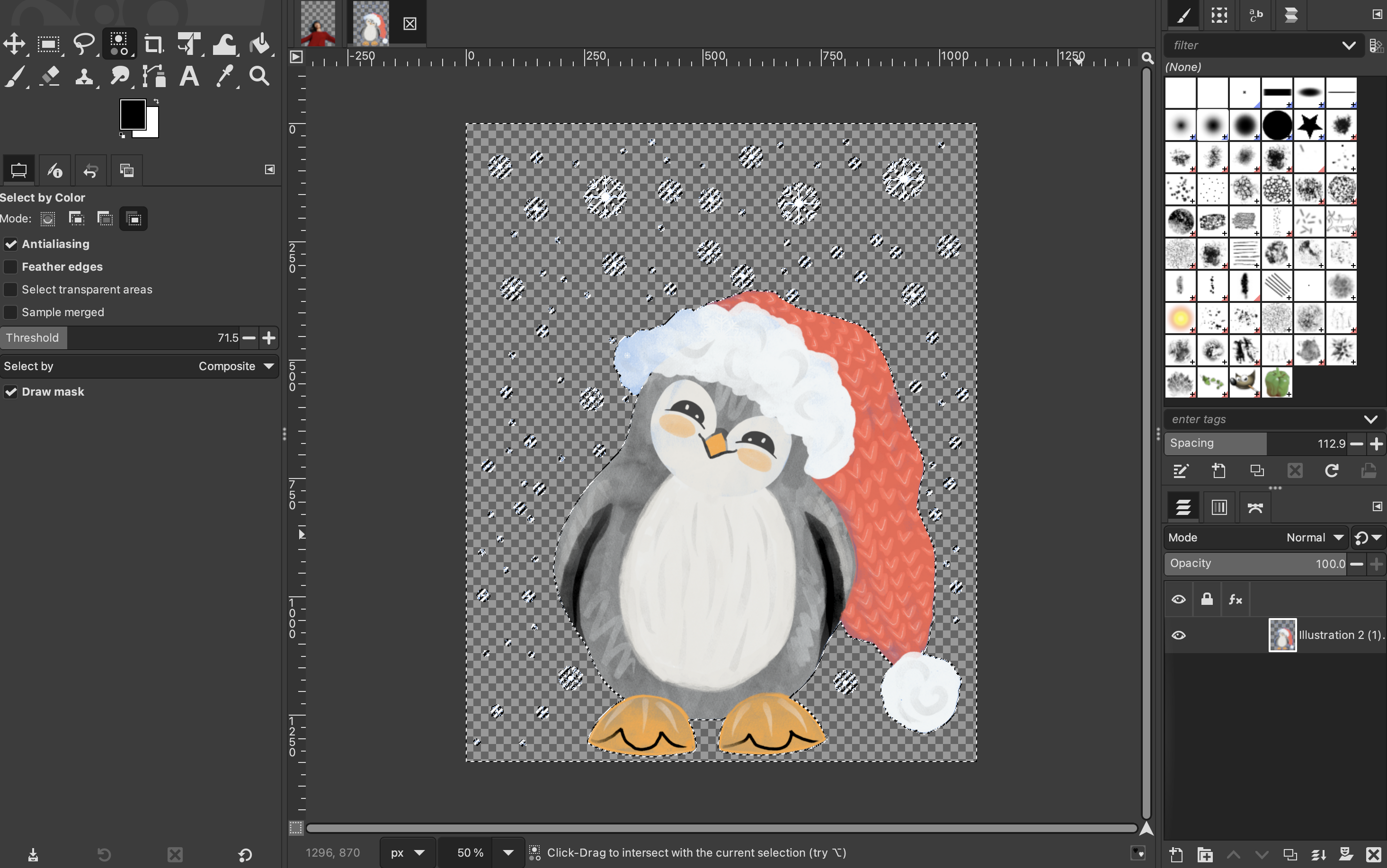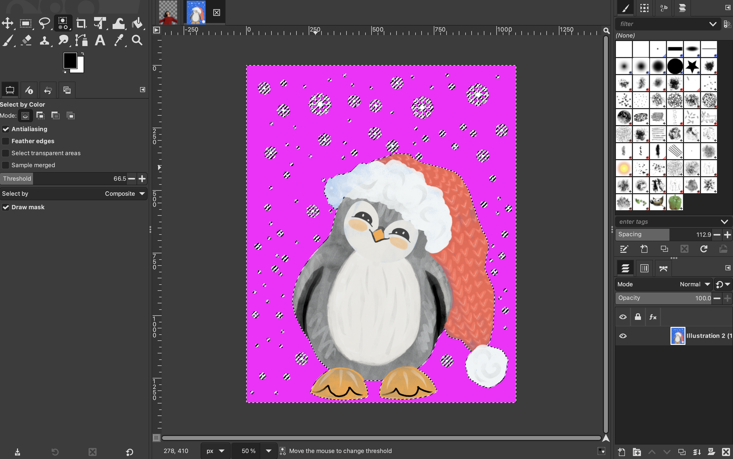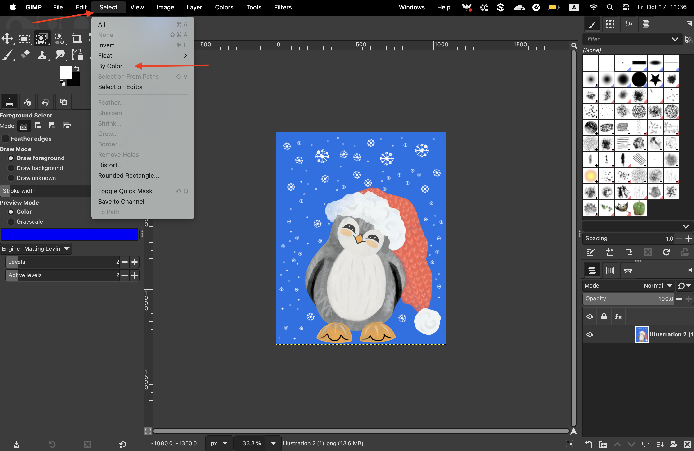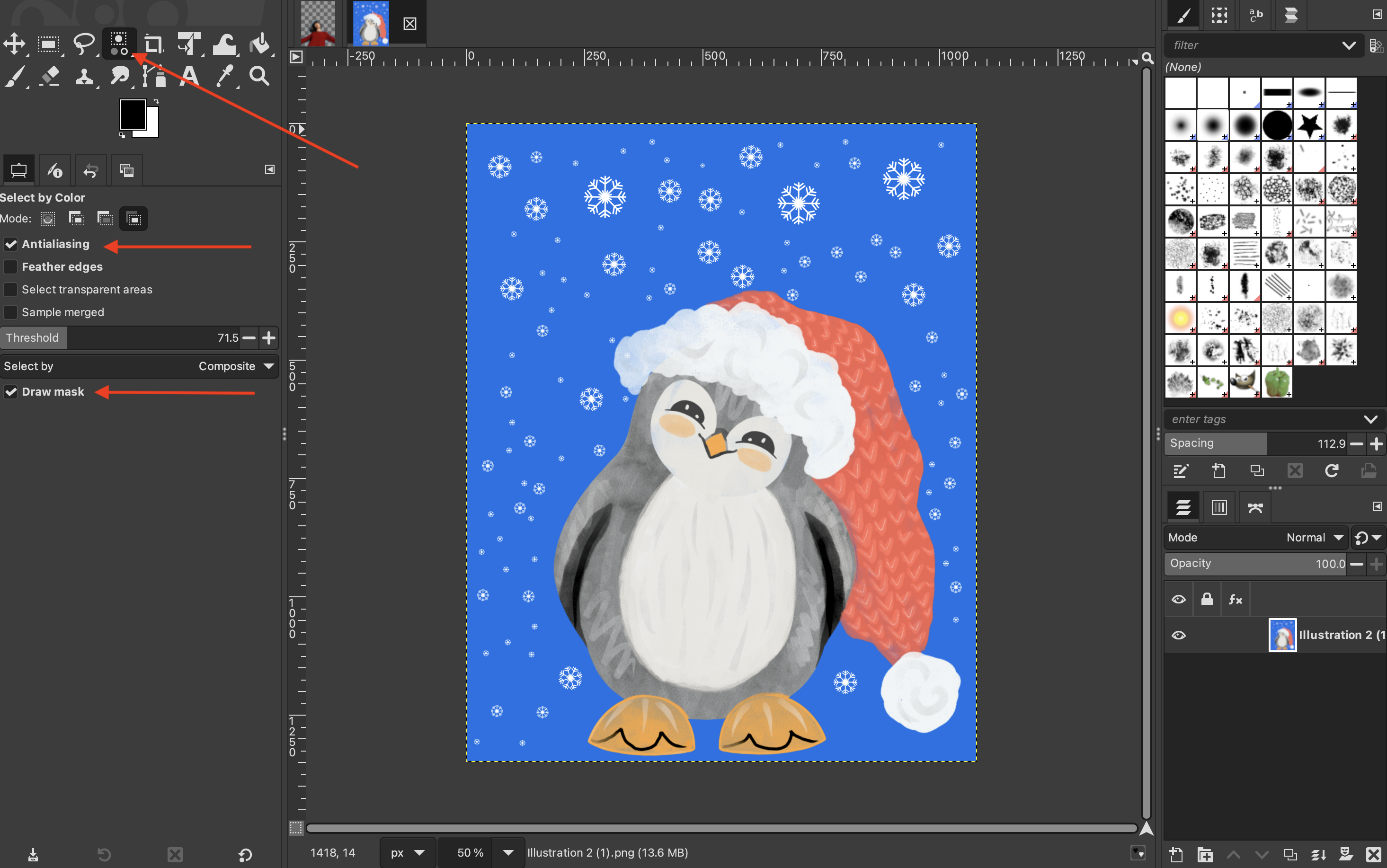 Ensure that “Antialiasing” and “Draw mask” are selected. If you are working with a photograph, you should also select “Feather edges”. If you are working with an illustration, then that won’t be necessary. Select the “Select by color” tool. If you cannot see it in your toolbox, you can access it by clicking on “Select” > “By Color” from the top menu.