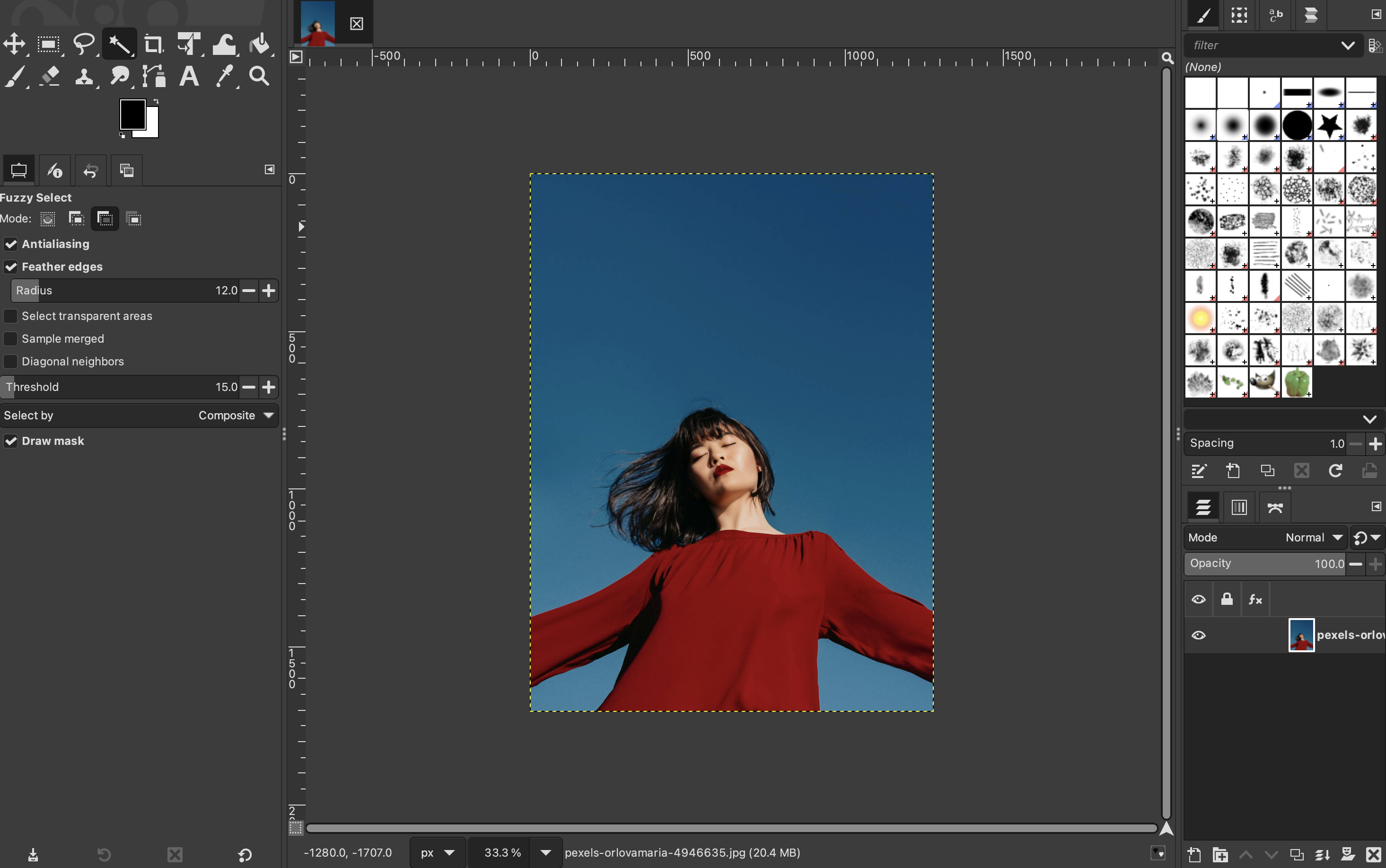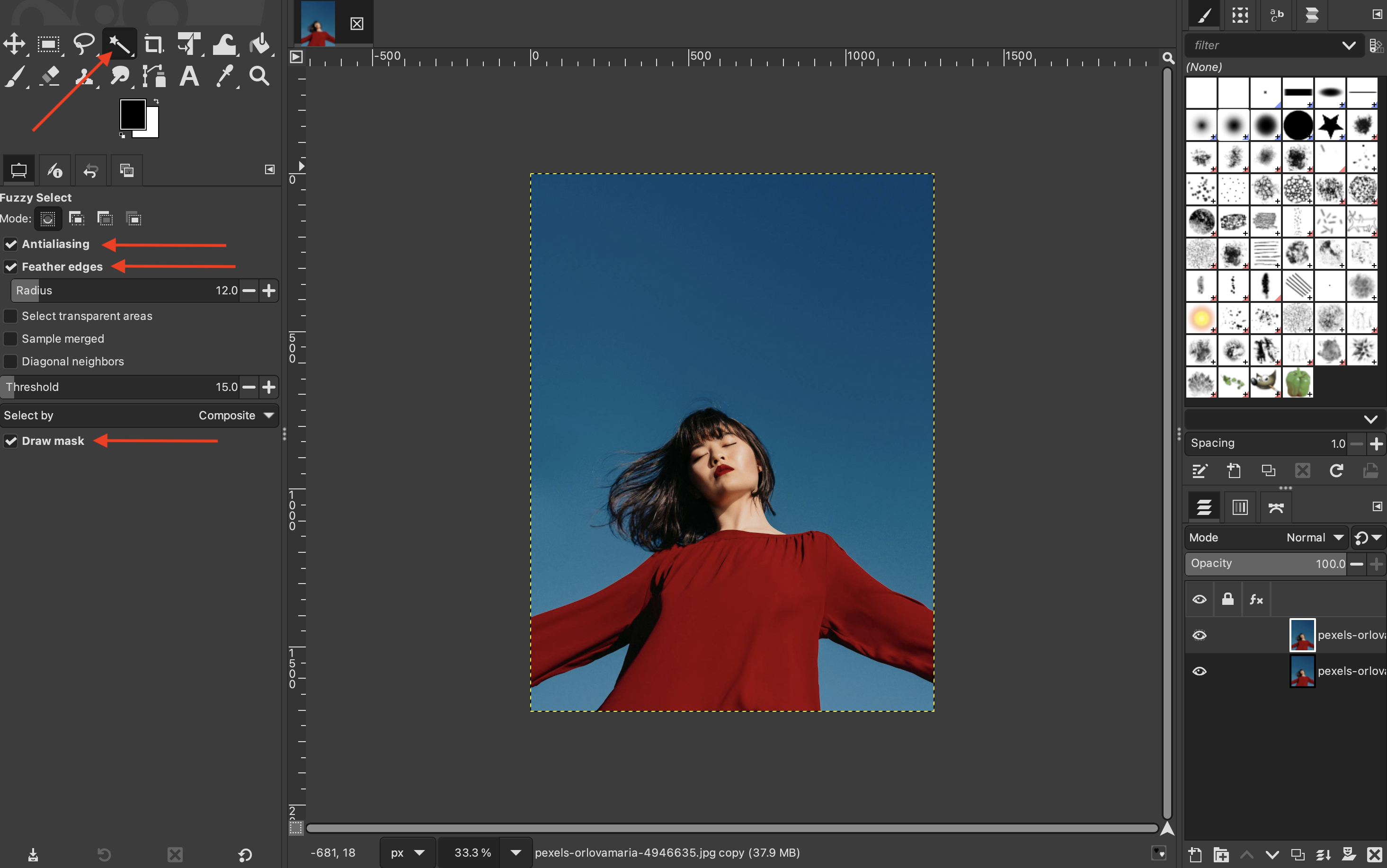Select “Fuzzy select tool” (Magic Wand) in the toolbox. Ensure that “Antialiasing”, “Feather edges”, and “Draw mask” are all checked.