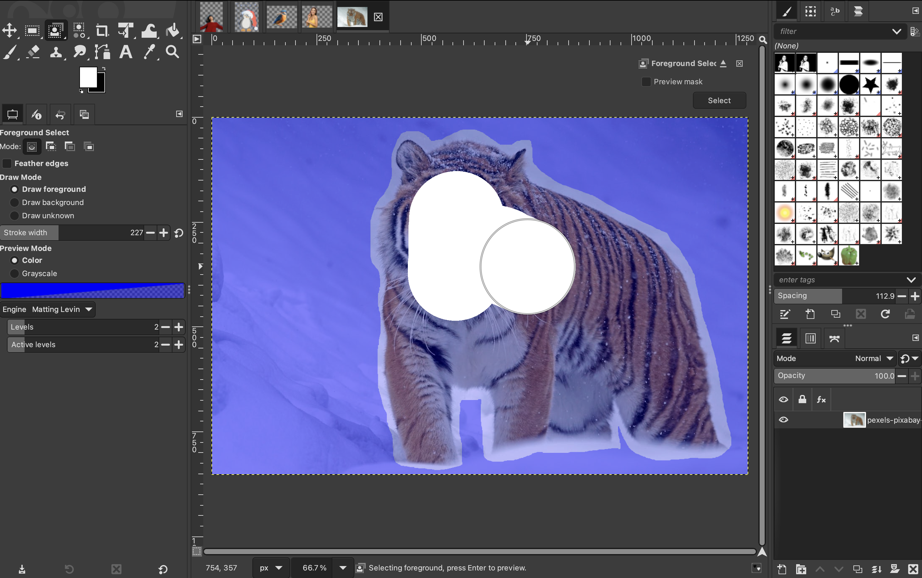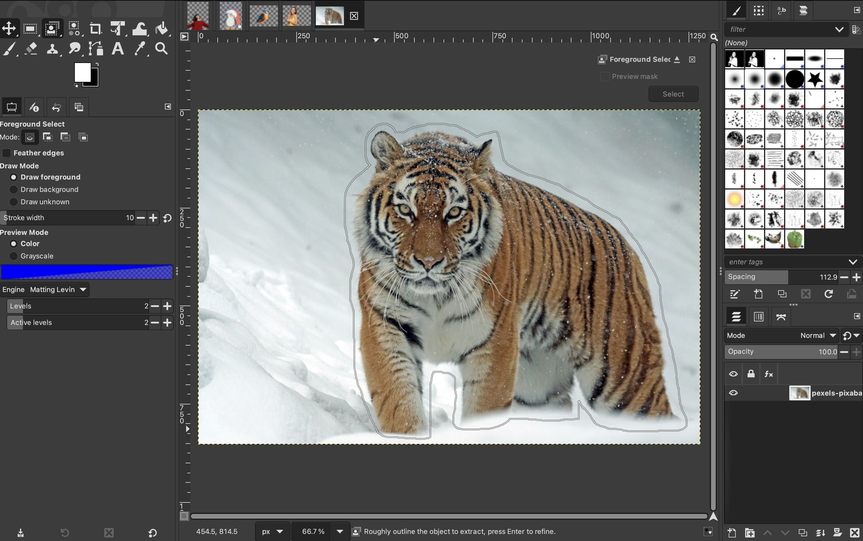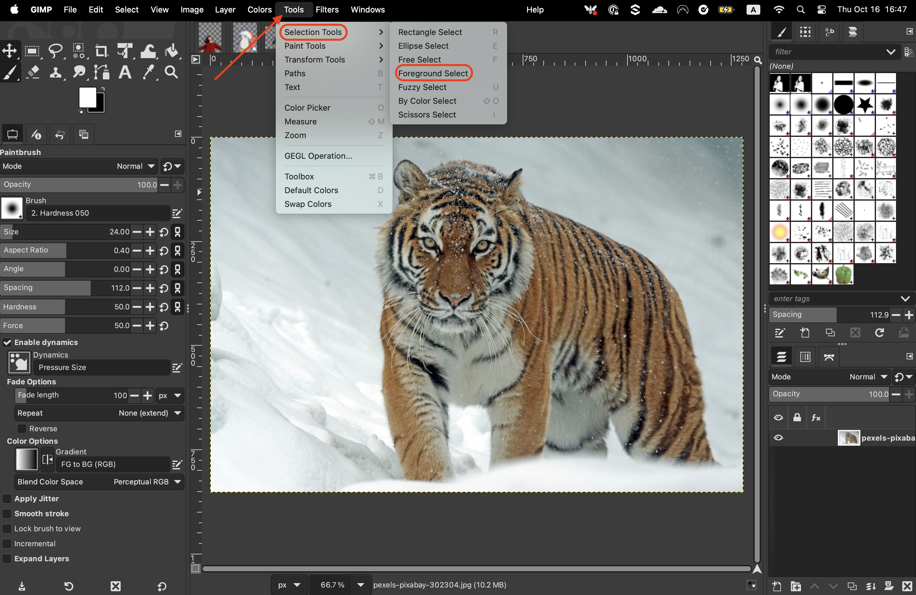 To begin with, select the Foreground Select Tool. If it’s not in the toolbox, go to “Tools”, “Selection tools”, and “Foreground Select.”