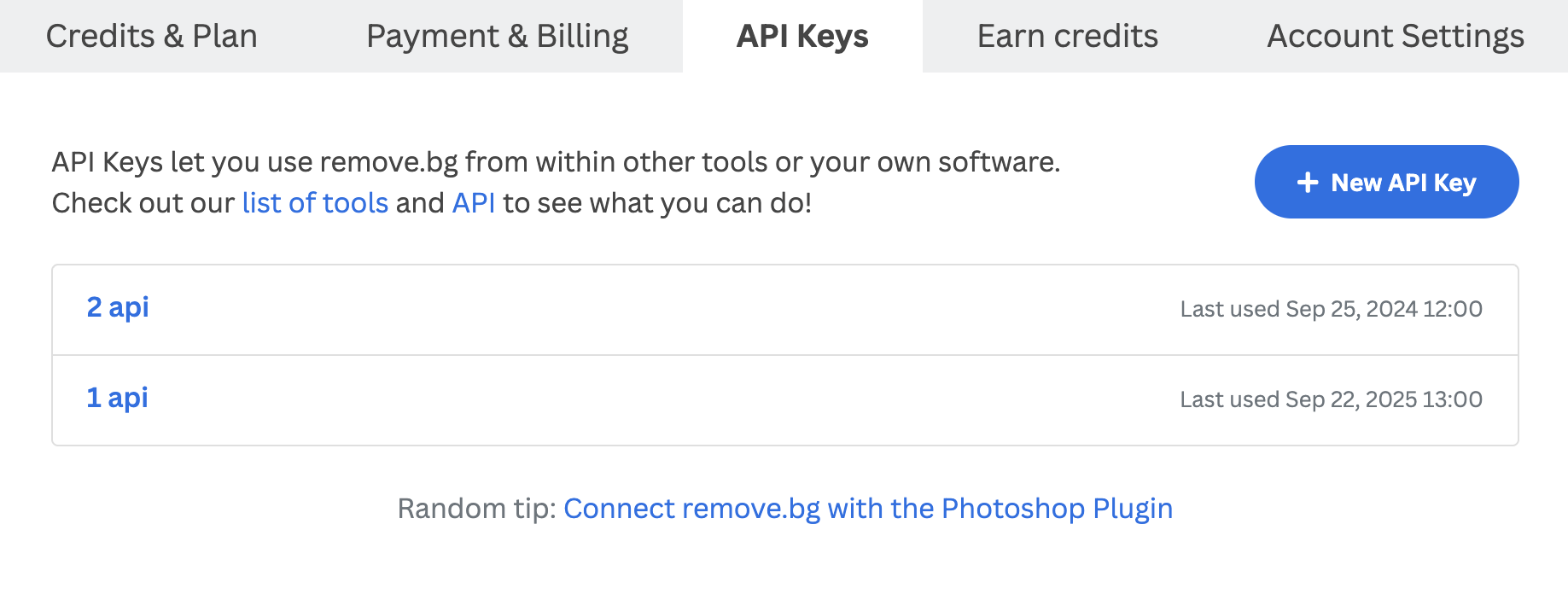 An application programming interface (API) key is a unique identifier used to authenticate a user, developer, or calling program to an API. With our open API, you can connect remove.bg to hundreds of apps or build your own. You will find your API key in the account’s settings, you can also re-issue it at any time. You can create up to 10 API keys.